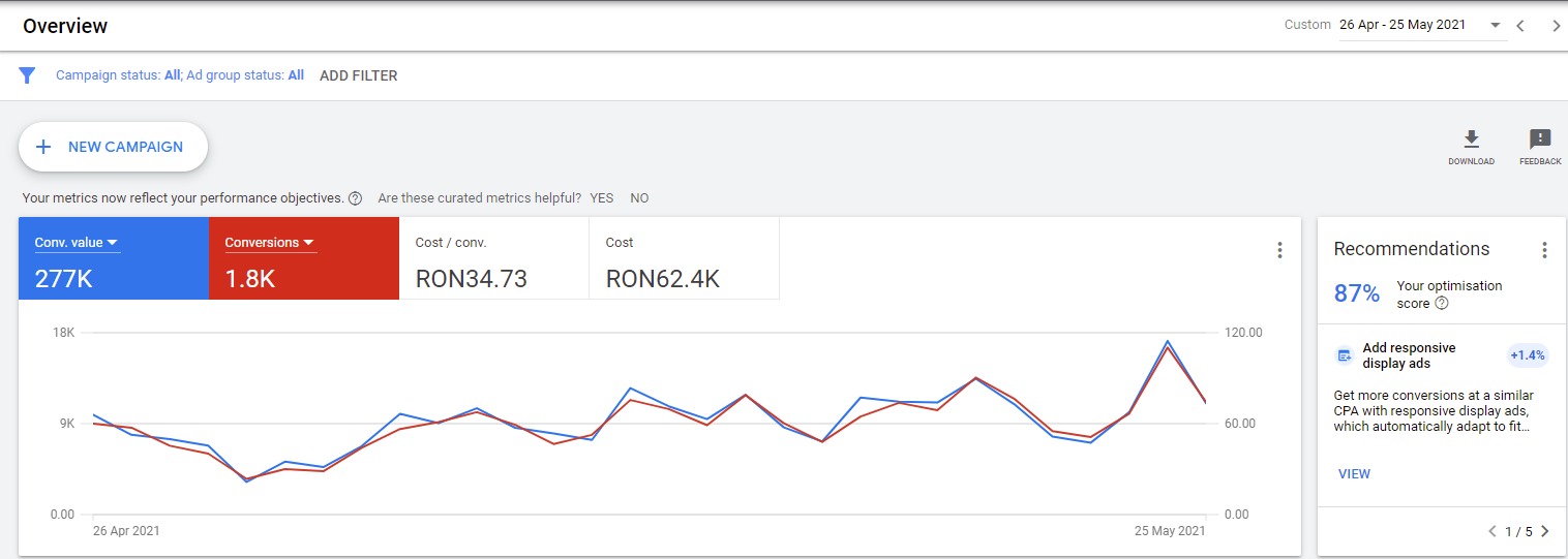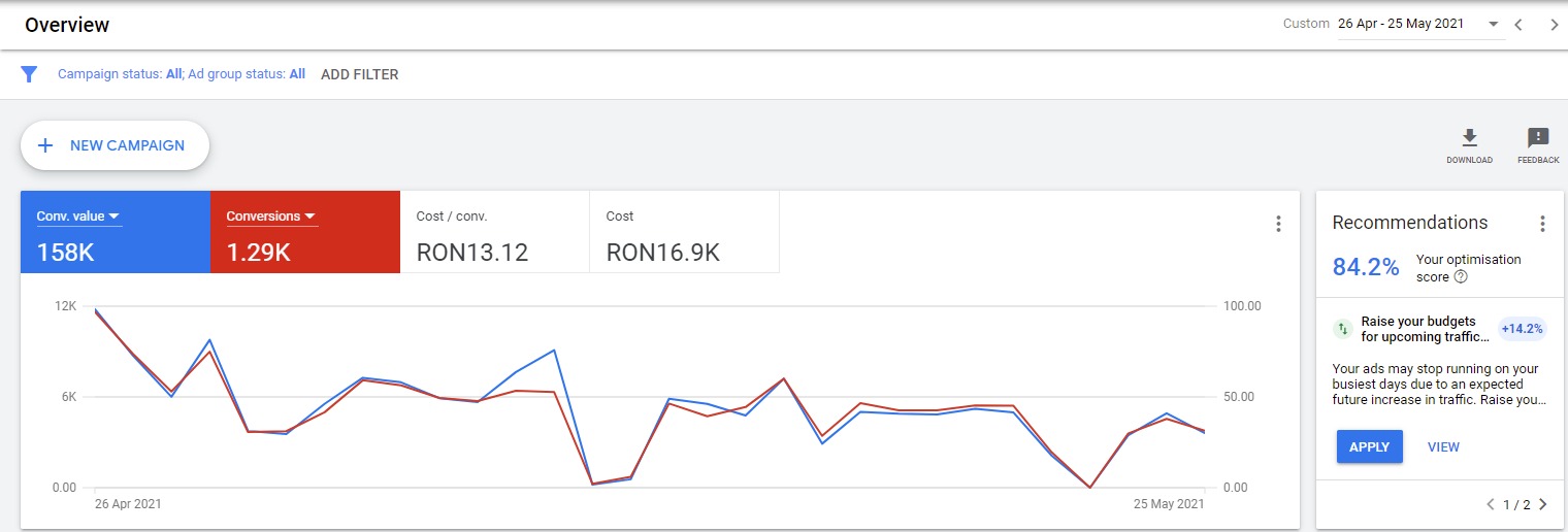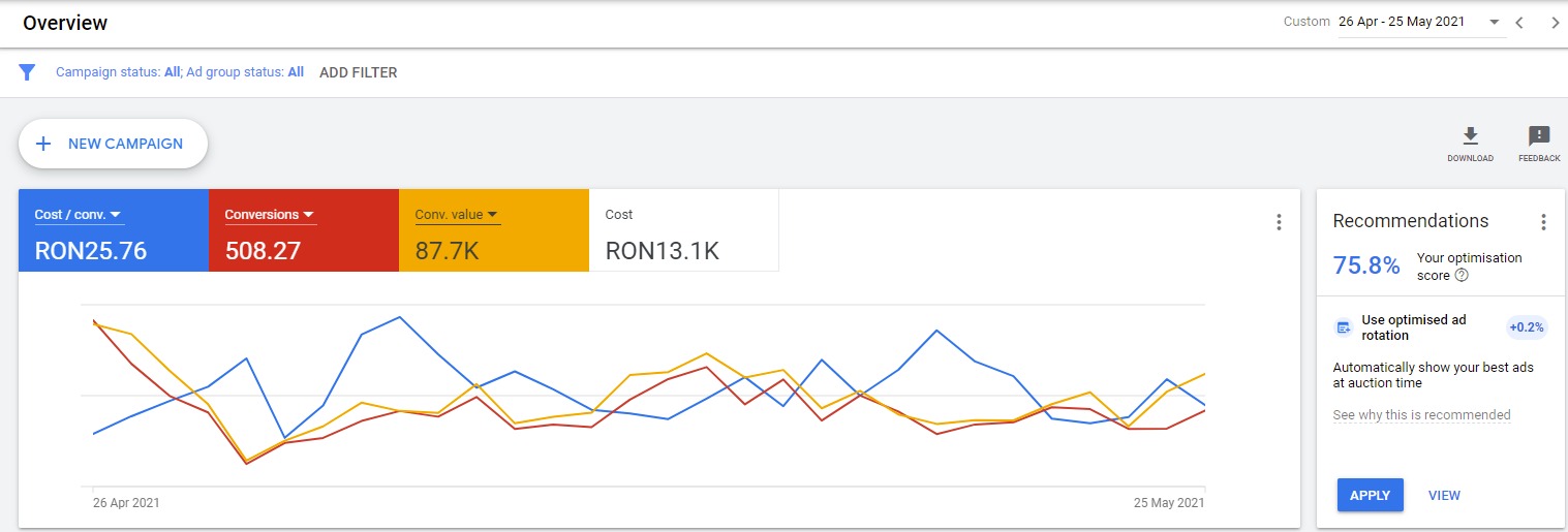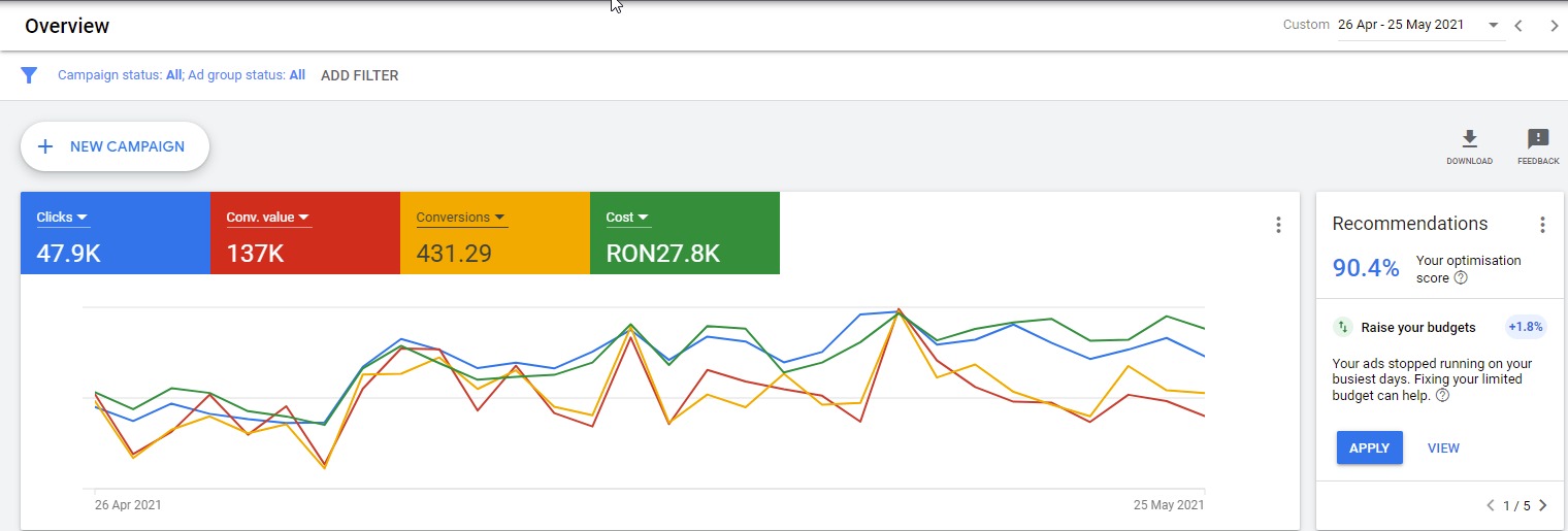 Atunci cand faci primii pasi pentru a-ti promova online afacerea, ai nevoie de o strategie temeinica. Campaigns te ajuta sa iti setezi de la zero strategia personalizata pentru a atrage noi clienti. Efectuam un audit al site-ului tau dar si al contului de Google Ads, in urma caruia propunem o strategie, un buget si un mix benefic de Google Search, Google Display, YouTube, Shopping si Retargeting Ads.